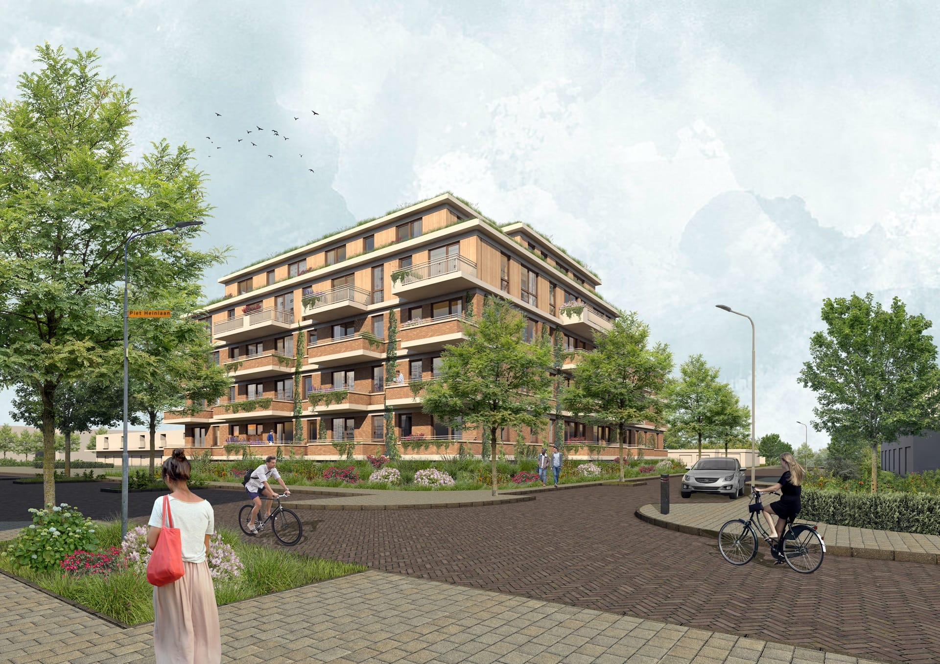 Onder het appartementencomplex komt een half verdiepte, betonnen parkeergarage met een fietsenstalling en 39 autoplaatsen. Er komen ook extra parkeerplaatsen rondom het gebouw. De eerste bouwlagen worden qua constructie ook van beton, de twee hoogste bouwlagen worden volledig in hout uitgevoerd. Mogelijk krijgen de lagere verdiepingen wel houten gevelpanelen - daar buigt de ontwikkelaar zich nog over.